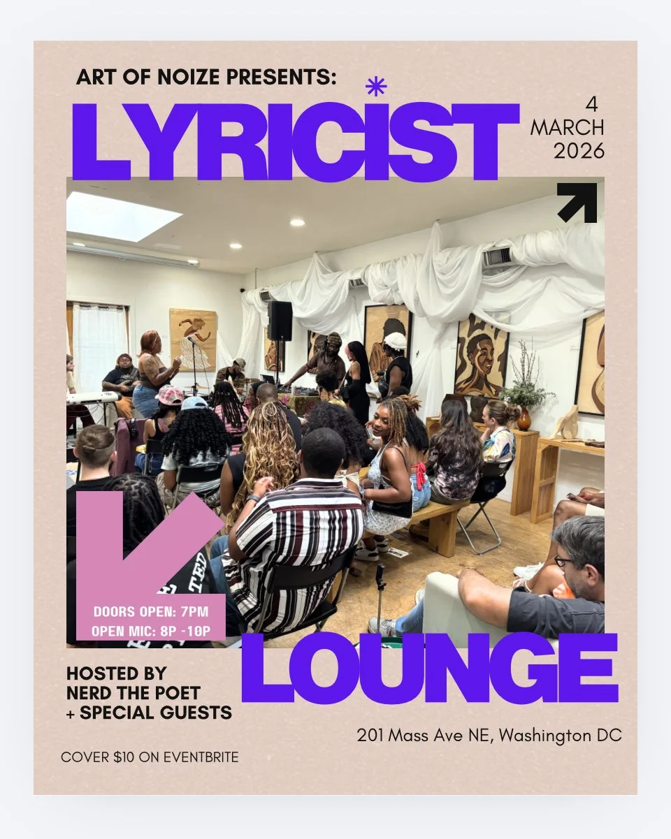 Introducing the new Art of Noize Open Mic-Lyricist Lounge! This is a monthly event held at The Consortium (201 Massachusetts Ave. NE, DC) with an emphasis on poetry, spoken word and lyricism. This is a dedicated space for poets, vocalists, and MCs to step into their craft fully - to write boldly, perform authentically, and connect with others who take the word seriously. The Lyricist Lounge is built for those who live in the verse!